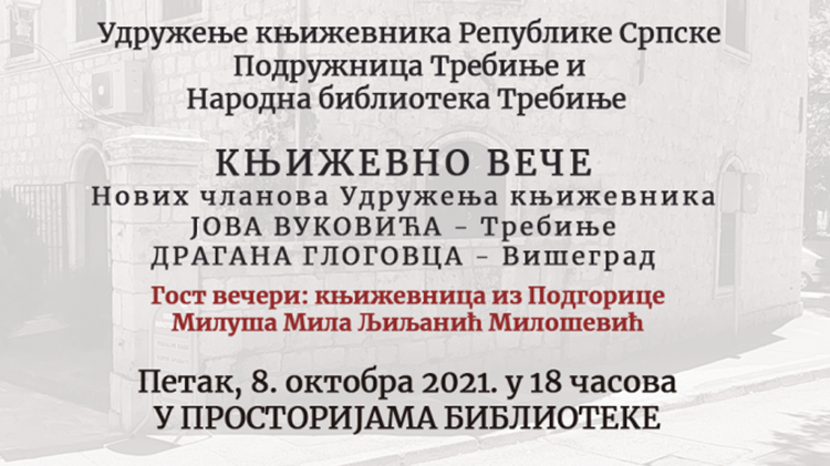Udruženje književnika Republike Srpske – Podružnica Trebinje i Narodna biblioteka Trebinje sutra organizuju književno veče novih članova Udruženja.