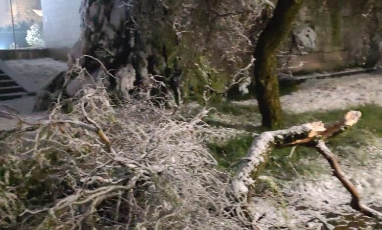 BILEĆA – Težak i vlažan snijeg koji je u kratkom periodu prekrio grad oštetio je stabla u parkovima, lomivši grane pod svojom težinom.