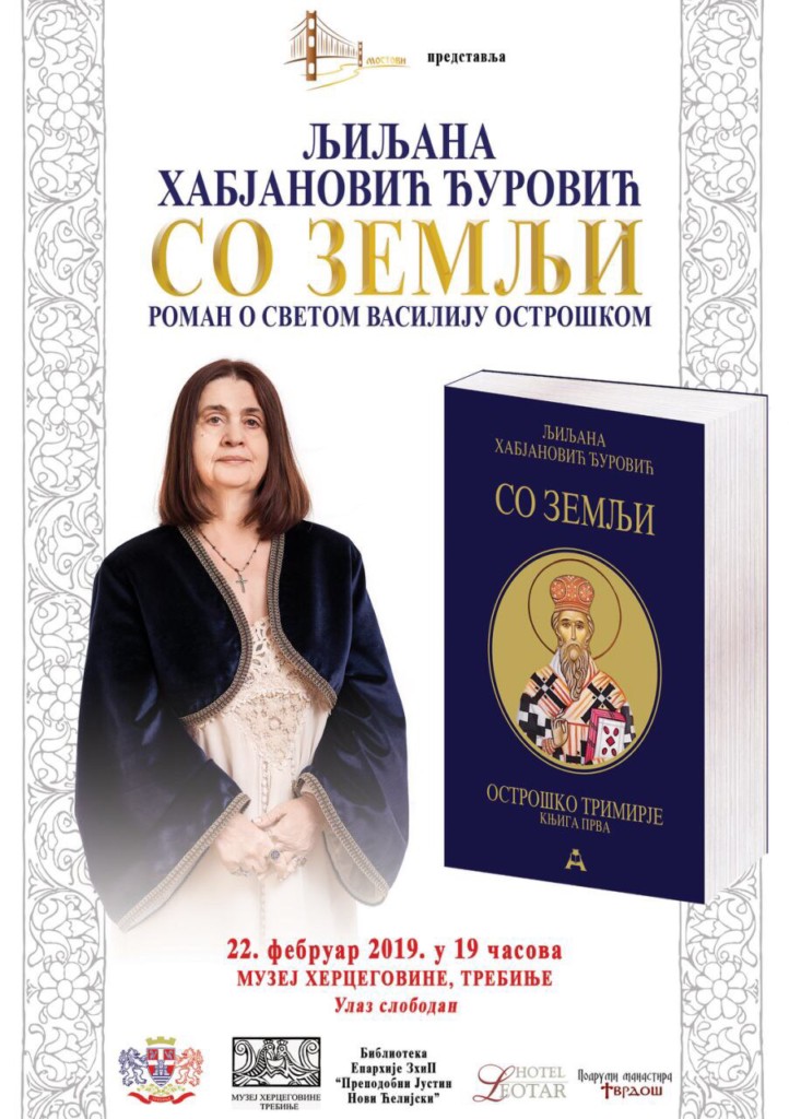 Ljiljana Habjanović Đurović će večeras u 19. časova u Muzeju Hercegovine Trebinjcima predstaviti novi roman o Svetom Vasiliju Ostroškom , „So zemlji“.