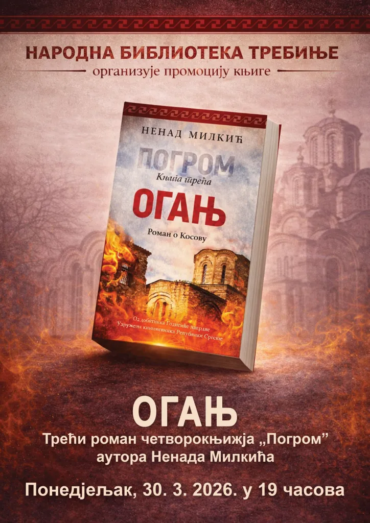 Narodna biblioteka Trebinje organizuje promociju romana „Oganj” autora Nenada Milkića, koja će biti održana u ponedjeljak, 30.marta u 19.00 časova u prostorijama Biblioteke.
